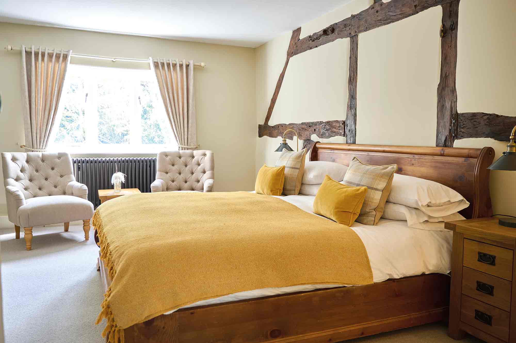 The nine individually styled bedrooms are located on the first floor and feature original oak beams, soft furnishings and views across rolling hills and woodland. A leisurely breakfast is included, with a choice of a full English or vegan feast, eggs royale, avocado on toast or wholesome granola bowls.