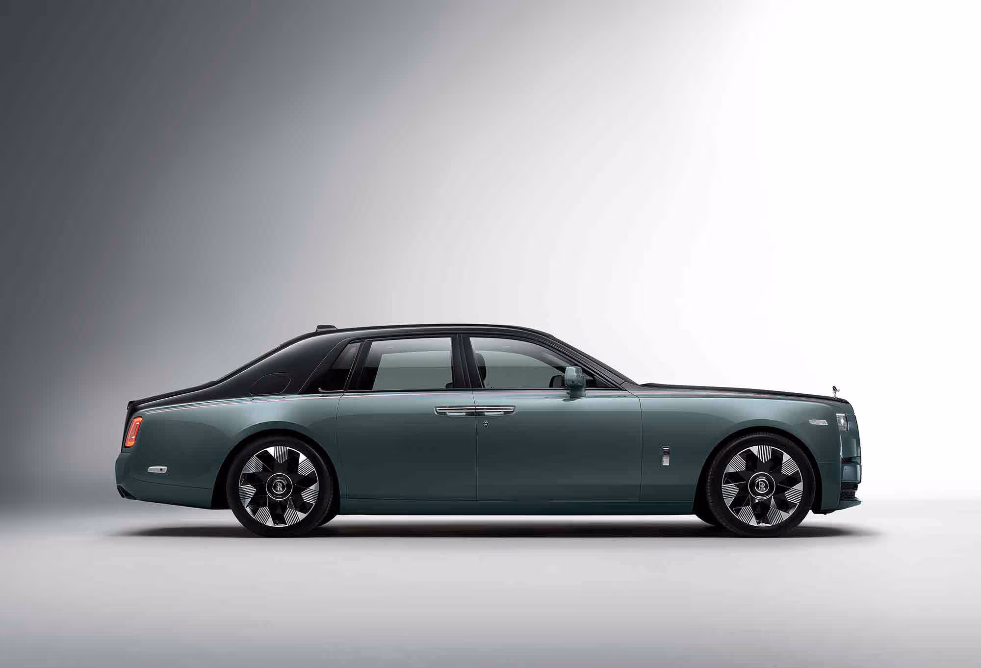 The side profile is a signature characteristic of Rolls Royce, with its short front, long rear overhang, long wheelbase and broad c-pillar. The wheels are new - 3D, milled, stainless steel with triangular facets, they can be fully or part-polished, depending on your preference. Or, if you prefer the 1920s style, you might choose the disc wheel in stainless steel or black lacquer.